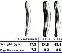 O.D. - OCULUS DEXTER OR RIGHT EYE Sphere - Refers to how nearsighted or farsighted you are. A (-) in front of the number indicates myopia, or nearsightedness. A (+) in front of the number indicates farsightedness, or hyperopia. Cylinder - Refers to the amount of astigmatism in your refractive error. Axis - This is measured in degrees, and will only be present in this column if you have astigmatism. The axis indicates the location, on a surface plane, where the astigmatism lies. Add - Indicates the power of magnification needed for MultiFocal lenses. This number will only be noted when the patient requires an additional reading correction (i.e. presbyopia and children with accommodative disorders). There are three different types of lenses Convex lenses are thicker in the center than at the edges, like a magnifying glass. Light rays are gathered together towards a central point. Convex lenses are used in glasses for farsighted (hyperopic) eyes that cant bend light rays as much as they need to. Convex lenses are indicated with a plus (+) symbol on prescriptions. Concave lenses are thinner at the center than at the edges and spread light rays apart. These lenses are used for eyes that are nearsighted (myopic). Concave lenses are indicated with a minus (-) symbol. Cylindrical lenses are curved more in one direction than the other. To tell if your lenses are cylindrical, hold your glasses at arms length and sight a straight line through the lens. Rotate the glasses clockwise and counterclockwise. If the line bends, its a cylindrical lens. Cylindrical lenses, used for astigmatism, are usually part of a prescription for near or farsightedness. Lens Materials Polycarbonate lens material (index of refraction is 1.586) allows for the highest level of impact resistance as well as creating a thinner lens than regular ophthalmic plastic lenses. The weight of these lenses are also lighter. Scratch resistant coatings are applied to both front and back surfaces and the material inherently absorbs ultraviolet light. Polycarbonate lenses should be used if vision is reduced or lost in one eye, in order to help protect the better eye from damage due to impact. Standard ophthalmic plastic lenses (index of refraction is 1.498) are made from a material called CR-39®. This material is available in the largest amount of lens styles and has become the most common material used since its inception. The lens is available with or without scratch resistant coatings and can be tinted to a wide variety of colors and density. Ultraviolet absorption is near 85% and U.V. coatings can be applied to increase the absorption to near 100%. Ophthalmic crown glass (index of refraction 1.523). This material has been utilized in prescription eyewear for the longest period of time. The surface is very scratch resistance and the lenses must be replaced if they become pitted or scratched. Glass lenses are tempered in order to increase their impact resistance and then submitted to a drop ball test in which a 5/8 inch diameter steel ball is dropped from 50 inches onto the center of the front surface of the lens. When a lens becomes scratched or pitted, the impact resistance is decreased. The weight of the lenses is more than plastic materials and ultra violet protection is minimal in a clear lens and more substantial in a photogrey version. High Index Plastic (index range 1.54 to 1.66). These lenses are made mostly from proprietary materials that result in a lens that is made thinner than crown glass or CR-39® plastic. Lens manufacturers are currently able to produce lenses with a high index of refraction value, which in turn creates a thinner lens. The index of refraction is the relationship between the speed of light in air and speed of light through the lens material. Having the lens materials designed with a higher index of refraction creates light rays to focus more effectively therefore requiring less lens curvature, which results in a thinner lens. Being able to have less lens thickness is what lessens the weight of the lens, with exception to high index glass materials (indices 1.7, 1.8, 1.9) which is much thinner than high index plastic yet has more weight due to a greater specific gravity weight. Aspheric lens design An aspheric design allows for a flatter lens surface. This improves the vision quality toward the edges of the lens; thus, enhancing the area of vision when looking through the peripheral areas of the lens. This enhancement is most effective and noticeable with prescription lenses ranging from 3 diopters of power or greater. The more prescription power the lens has, the greater the benefit from this type of lens. Comparative