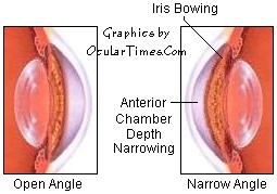 Glaucoma Narrow Angle Glaucoma The "angle" refers to the physiological angle between the iris and the trabecular meshwork. When evaulating a patient for glaucoma, the physician examines this junction between the iris and the trabecular meshwork. An "open angle" means that the junction is wide enough to allow a normal flow of fluid through the trabecular meshwork. A "narrow angle" means that the junction is too narrow for fluid to flow normally, creating a risk of fluid backup which can cause increased eye pressure. As pressure rises, the iris may begin to bow forward, further restricting the flow of fluid and creating a shallow anterior chamber. · Narrow Angle Glaucoma (NAG) · Acute Narrow Angle Closure
