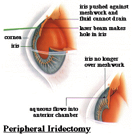 In emergency cases of acute angle closure, the patient will be given several medications to help lower the IOP while in the hospital or clinic. These medications may be given prior to, or during, the peripheral iridectomy procedure in an effort to reduce significantly high pressure as quickly as possible. Peripheral iridectomy may be repeated if the desired IOP is not achieved after the initial procedure. Patients who undergo this procedure may experience an increased sensitivity to light, with mild glare noted with night driving. This is due to the increased amount of light entering the eye through the iridectomy opening.