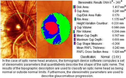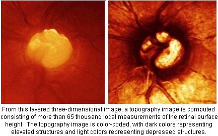 Retinal Tomography High quality ophthalmic care depends on the accurate assessment of ocular disease. Conventional direct ophthalmoscopy is used widely and provides good two dimensional views of the retina. However, the true nature of retinal disease is apparent only in three dimensions. Scanning laser ophthalmoscopes offer a radically different view of eye disease since they provide three dimensional views of the retina. The three dimensional imaging of the retina has been facilitated by two technical developments. The first is the availability of cheap and powerful computers. The second is the production of affordable optoelectronics such as digital cameras and diode lasers. The devices use laser light rather than conventional white light to image the fundus. A low powered diode laser beam scans the retinal surface to build up an image of the retina line by line, analogous to the formation of images on a television screen. Several variants of this scanning technology exist, each providing slightly different views of retinal structure. Diagnosing and Monitoring Glaucoma Disease The retinal tomographer is a confocal laser scanning system for acquisition and analysis of three-dimensional images of the posterior segment of the eye. The general application of the retina tomograph is the quantitative assessment of the retinal topography and the quantification of topographic changes. Examples are the description of the glaucomatous optic nerve head, the analysis of macular holes and macular edema, and the analysis of nerve fiber layer defects. The following concentrates on the application of the retina tomograph in glaucoma management. The goal of the topographic analysis of the optic nerve head is either a quantitative description of its current state with the goal of a classification - e.g. normal or not normal - or to compare more than one topography image in order to follow up topographic changes and to quantify progression of glaucoma.