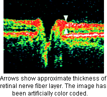 Glaucoma is a loss of nerve fibers and subsequent loss of visual field. The nerve fiber layer carries visual signals from the retina, to the optic nerve and then on the brain. By accurately measuring the thickness of the retinal NFL thickness and comparing the results statistically to a set of known patients, matched in gender and age, to the patient, it is possible to predict which patient may be at risk to develop glaucoma. The earlier glaucoma is detected and effective and aggressive treatment is begun, the less likely the patient will be to suffer serious visual damage in the long term from glaucoma. Perhaps the most dramatic development in glaucoma detection has been optical coherence tomography. Optical coherence tomography (OCT) is analogous to ultrasound. But rather than measuring sound, it measures the backreflection of infrared light, which is reflected differently by different tissues. OCT creates a viewable image in which interference patterns generated from the reflection of partially coherent laser light are used to construct an optical cross section of the retina.